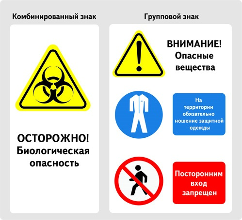 Групповые знаки содержат на одном прямоугольном блоке два и больше основных символов с поясняющими надписями. Их используют, если нужно донести до сотрудников комплексные требования (рисунок).